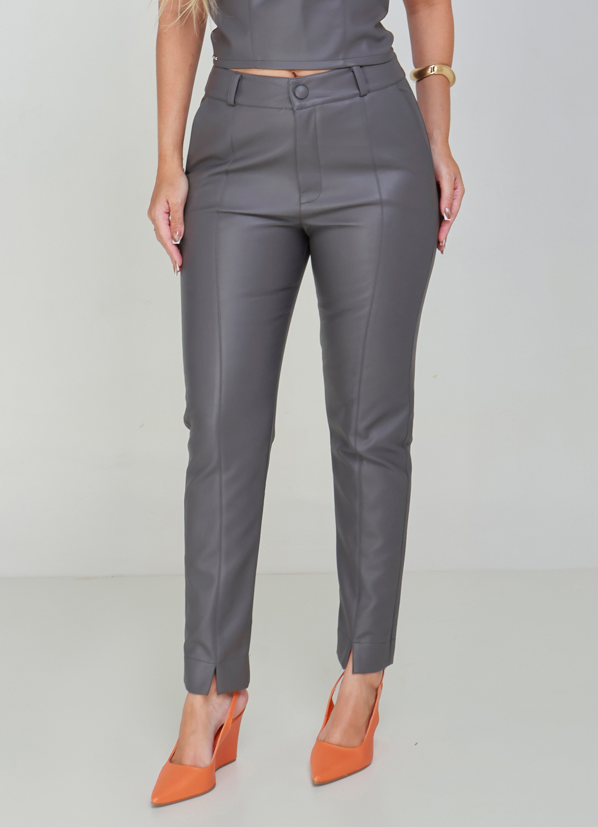Elegância contemporânea com acabamento sofisticado. A Calça Alfaiataria Milano Slim em Couro Sintético Premium foi criada para mulheres que valorizam peças marcantes, versáteis e impecavelmente estruturadas.