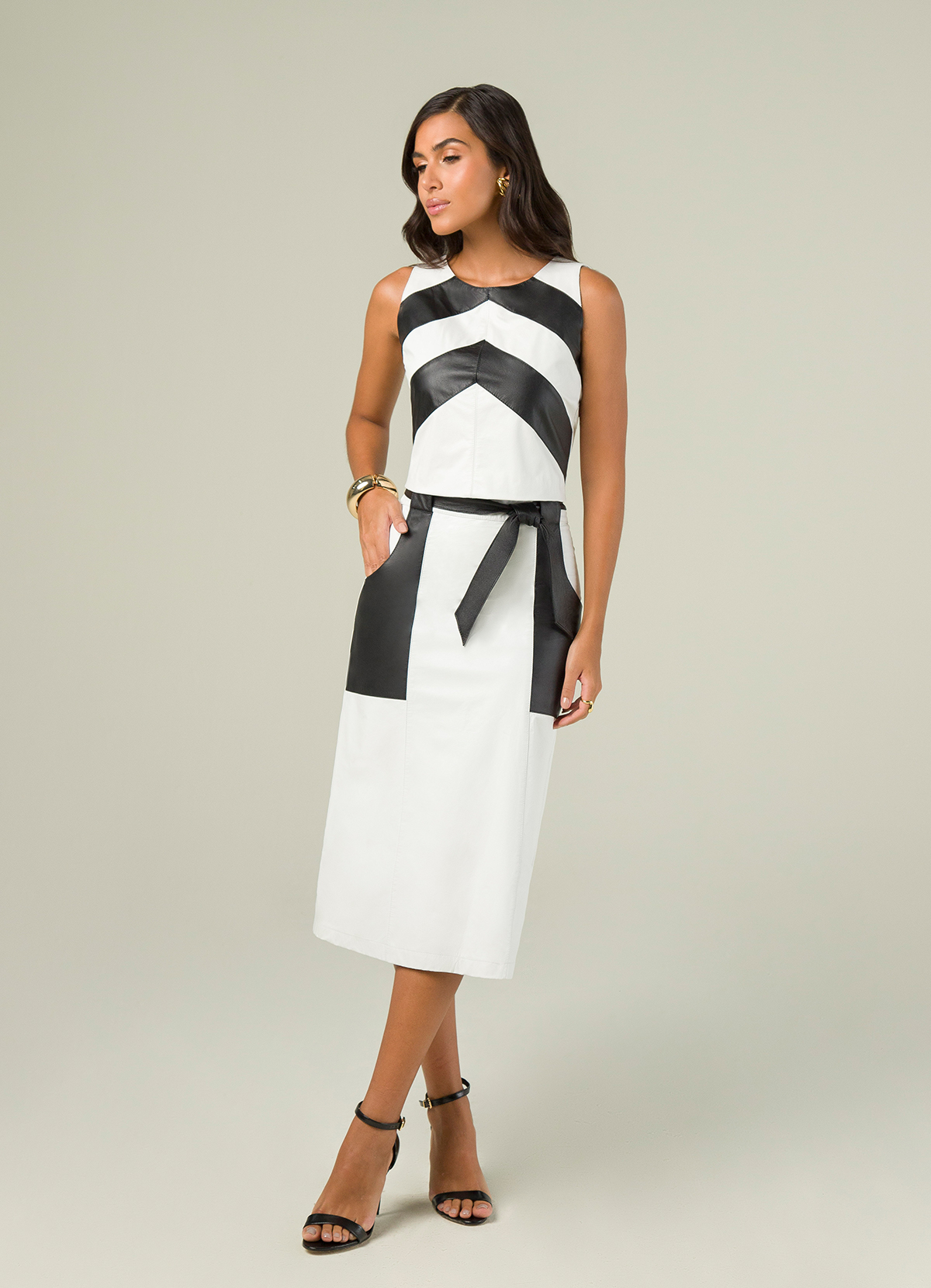 Conjunto Cropped Elen e Saia Bianca Bicolor em PU Sintético Premium