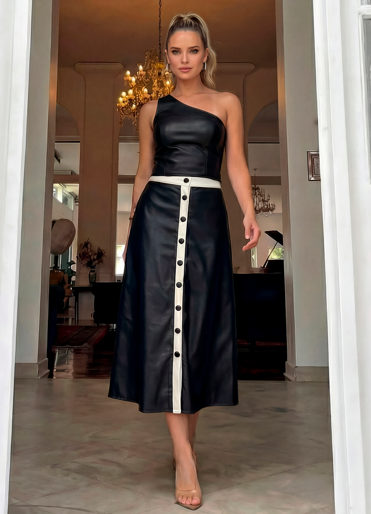 O mood perfeito entre elegância e sofisticação. Confeccionado em Couro Sintético Premium, o conjunto entrega caimento impecável, conforto e um toque de luxo que eleva seu estilo a outro nível.