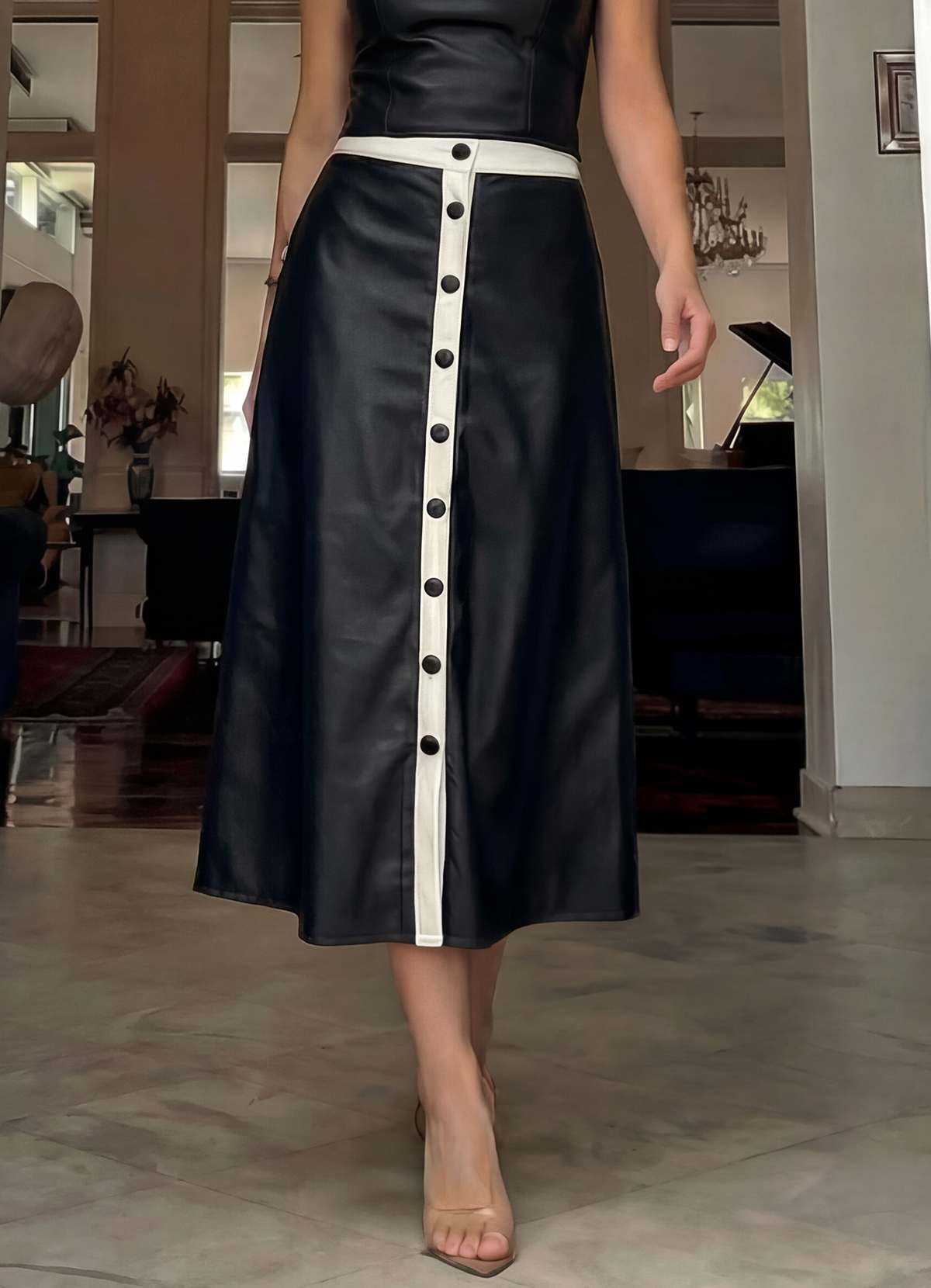 O mood perfeito entre elegância e sofisticação. Confeccionado em Couro Sintético Premium, a Saia Vitória Bicolor entrega caimento impecável, conforto e um toque de luxo que eleva seu estilo a outro nível.